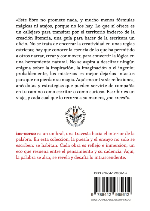 «Este libro no promete nada, y mucho menos fórmulas mágicas ni atajos, porque no los hay. Lo que sí ofrece es un callejero para transitar por el territorio incierto de la creación literaria, una guía para hacer de la escritura un oficio. No se trata de encerrar la creatividad en unas reglas estrictas; hay que conocer la esencia de lo que ha permitido a otros narrar, crear y conmover, para convertir la lógica en una herramienta natural. No se aspira a descifrar ningún enigma sobre la inspiración, la imaginación o el ingenio; probablemente, los misterios es mejor dejarlos intactos para que no pierdan su magia. Aquí encontrarás reflexiones, anécdotas y estrategias que pueden servirte de compañía en tu camino como escritor o como curioso. Escribir es un viaje, y cada cual que lo recorra a su manera, ¿no crees?».